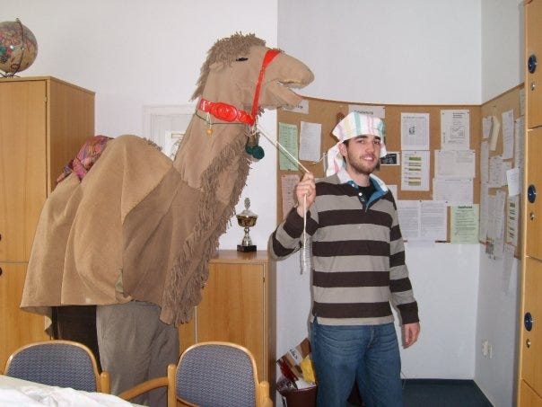 Being a particularly Catholic region where I lived, carnival was serious business. At the school where I worked, lessons were temporarily halted for celebrations in the hall. Having only been in the country for a couple of months at this point I had very little idea what all this madness was in aid of. At one point I was made to dress as a camel herder and lead the Head Master and Deputy Head, dressed as the front and rear parts of a camel, around the building.